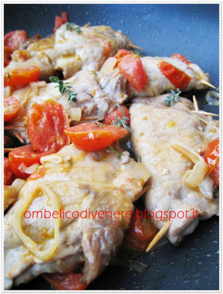In una casseruola scaldate qualche cucchiaio di olio evo, tagliate la cipolla a rondelle non troppo sottili e mettetele a cuocere, dopo pochi minuti unite la carne e fatela rosolare bene da entrambi i lati, sfumate con una tazzina di vino bianco, lasciatelo evaporare completamente e unite i pomodorini tagliati a metà e a piacere qualche oliva, fate cuocere qualche minuto poi allungate con un mezzo bicchiere di acqua, salate e fate restringere. Lavate e sminuzzate la maggiorana e spolveratela sulla carne.