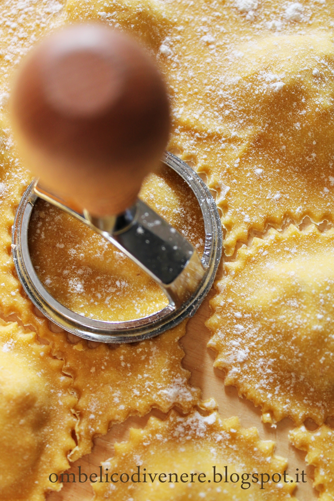 Stendete la pasta sottile, in una metà della sfoglia disponete il ripieno a mucchietti distanziati tra loro considerando al grandezza dei cappellacci che volete fare, se necessario inumite la pasta con poca acqua. Rovesciate sopra la seconda metà dell’impasto e schiacciate attorno ad ogni mucchietto di ripieno iniziando dalla parte dove avete piegato la pasta, in questo modo eliminerete l’aria che c’è tra le due sfoglie. Tagliate i cappellacci e fateli asciugare circa mezz’ora.