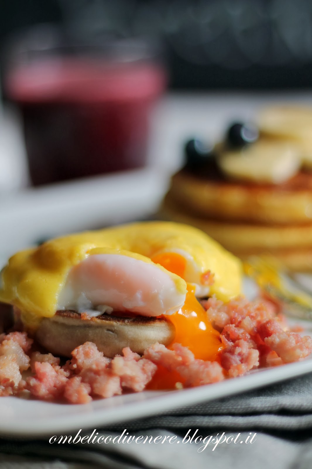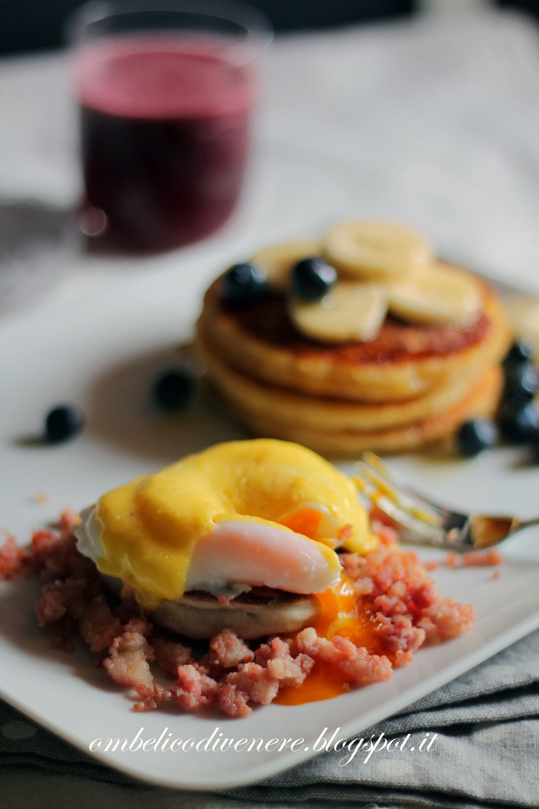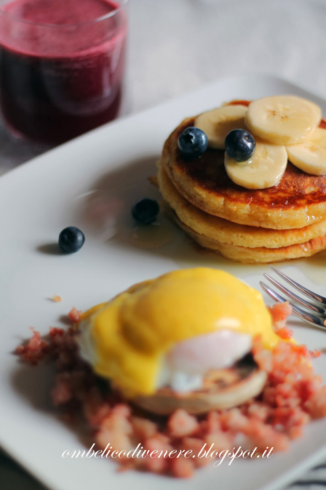 Subito ho pensato “magari chiedo se posso fare la mia colazione a rate, oggi potrei fare i muffin, domani i pancake, e dopodomani salsa, uovo e bevanda.. poi loro si fanno un bel collage e creano la mia American breakfast…” mmmhh.. mi sa che non se pò fa!!! Qui ci vuole un giorno di ferie per preparare questa velocissima colazione, ma la cosa più difficile è stata incastrare i tempi, l’uovo all’ultimo quando già è tutto nel piatto, la salsa subito prima intanto che si scalda l’acqua per l’ovetto, i pancake ancora prima, e il succo!?!?… sgrana la melagrana che schizza ovunque, frulla assieme ai mirtilli, filtra tutto…. aiuto.. e pensate che ho avuto la bella idea di fare due versioni.. quindi in mezzo a tutto ciò c’era anche un’altro dolce e un succo che vedrete i prossimi giorni!!! Ok… la chiamano colazione ma se uno non si sveglia alle 5 non può che diventare un pranzo.. io lo ammetto, ho fatto “colazione” alle 13:30!!
